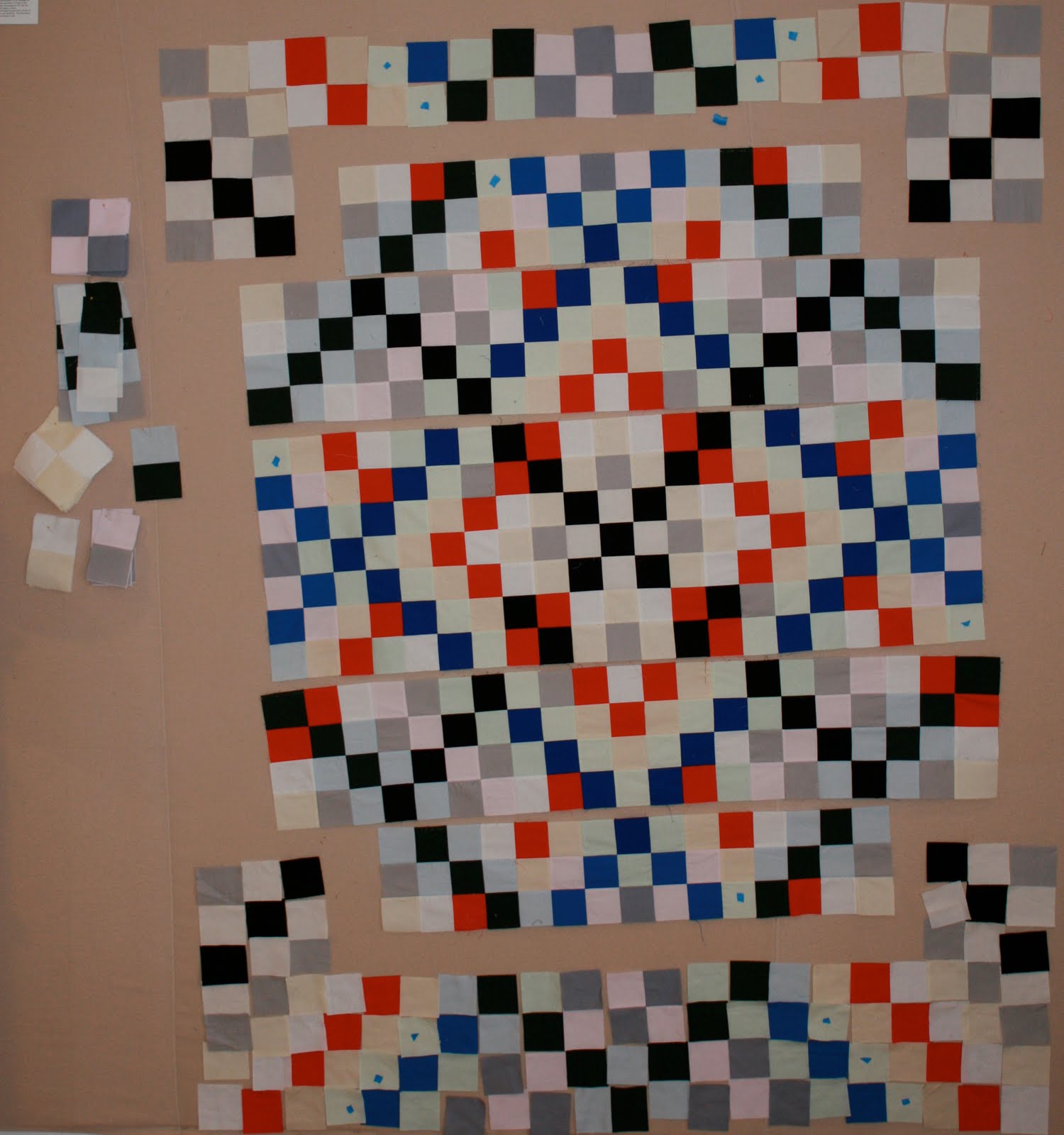 There has been progress, though yesterday I could not tell. See all the bits on the left — that is all the stuff I sewed that I can not use. Wrong colour, wrong lay out…